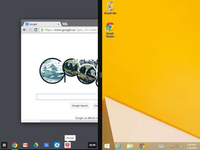 Μπορείτε επίσης να θραύση την επιφάνεια εργασίας Chrome μαζί με μία ή περισσότερες άλλες εφαρμογές των Windows 8. Στην πραγματικότητα, θα μπορούσατε να τραβήξετε την επιφάνεια εργασίας του Chrome παράλληλα με την τυπική επιφάνεια εργασίας των Windows και να τις χρησιμοποιήσετε δίπλα-δίπλα.