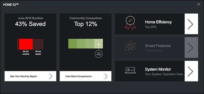 Ωστόσο, εάν ανοίξετε το Home IQ και υπάρχουν πολλές ενότητες για να διαλέξετε, τότε μπορείτε να πάτε. Αριστερά, έχετε τον συνολικό χρόνο εκτέλεσης για τον προηγούμενο μήνα. Στη μέση, υπάρχει η σύγκριση της κοινότητας, η οποία συγκρίνει το χρόνο εκτέλεσης του HVAC με άλλα σπίτια στην πολιτεία σας. Στην επάνω δεξιά γωνία βρίσκεται το Home Efficiency, το οποίο συγκρίνει πόσο καλά το σπίτι σας διατηρεί θερμική ενέργεια σε σύγκριση με άλλα σπίτια στην πολιτεία σας χρησιμοποιώντας δεδομένα από άλλους ιδιοκτήτες του Ecobee. Και στην κάτω δεξιά γωνία βρίσκεται το System Monitor, το οποίο σας δείχνει τις ώρες λειτουργίας του συστήματος HVAC, τη ρύθμιση της θερμοκρασίας και ποια ήταν η εξωτερική θερμοκρασία εκείνη τη στιγμή.