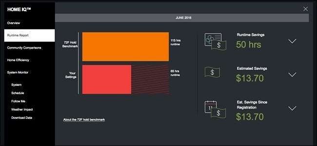 Η κόκκινη γραμμή δείχνει τον συνολικό χρόνο εκτέλεσης του συστήματος HVAC κατά τη διάρκεια του προηγούμενου μήνα και η πορτοκαλί γραμμή πάνω από αυτήν είναι μια εκτίμηση του συνολικού χρόνου εκτέλεσης εάν διατηρήσατε τη θερμοκρασία εσωτερικού χώρου σε 72 μοίρες. Με βάση αυτές τις πληροφορίες, το Ecobee σας λέει πόσα χρήματα εξοικονομείτε κάθε μήνα στη δεξιά πλευρά.