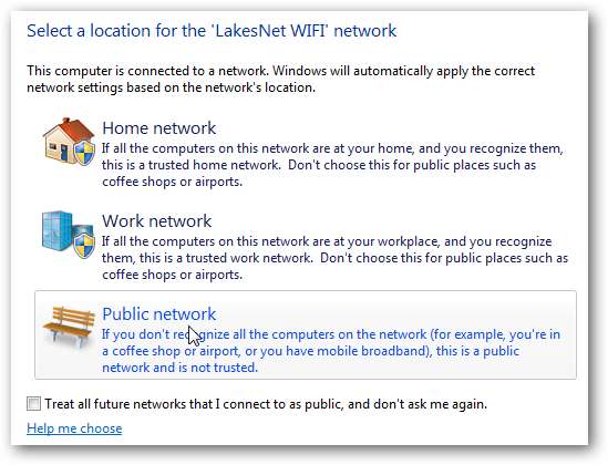 Αντί να ανησυχείτε για την αλλαγή των ρυθμίσεών σας κάθε φορά που συνδέεστε σε ένα δημόσιο δίκτυο. Όταν συνδέεστε για πρώτη φορά στο δημόσιο σημείο πρόσβασης, τα Windows θα σας ζητήσουν να επιλέξετε μια τοποθεσία για το δίκτυο. Για παράδειγμα εδώ θέλουμε να συνδεθούμε με το τοπικό καφενείο Wi-Fi.