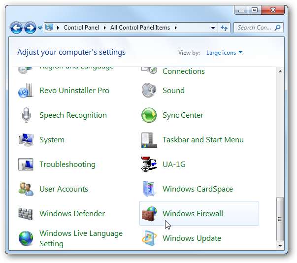 Είτε χρησιμοποιείτε το Τείχος προστασίας ενσωματωμένο στα Windows είτε μια εφαρμογή τρίτου μέρους όπως το ZoneAlarm, βεβαιωθείτε ότι είναι ενεργοποιημένο πριν συνδεθείτε σε ένα δημόσιο σημείο πρόσβασης. Κάντε κλικ στο Έναρξη και μετά στον Πίνακα Ελέγχου, βεβαιωθείτε Προβολή με μεγάλα εικονίδια επιλέγεται και, στη συνέχεια, κάντε κλικ στο Τείχος προστασίας των Windows.