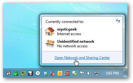 Η κοινή χρήση αρχείων και φακέλων είναι μια εξαιρετική δυνατότητα στα Windows 7 στο σπίτι, αλλά όταν βρίσκεστε σε δημόσιο δίκτυο, δεν θέλετε οι άλλοι να βλέπουν τα δεδομένα σας. Για να το απενεργοποιήσετε, κάντε κλικ στο εικονίδιο Δίκτυο στη γραμμή εργασιών και επιλέξτε Ανοιγμα Κέντρου δικτύου και κοινής χρήσης .