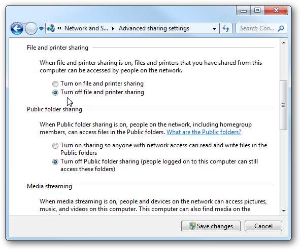 Τώρα φροντίστε να απενεργοποιήσετε την κοινή χρήση αρχείων και εκτυπωτών και να απενεργοποιήσετε την κοινή χρήση δημόσιου φακέλου… βεβαιωθείτε ότι έχετε αποθηκεύσει τις αλλαγές όταν τελειώσετε.