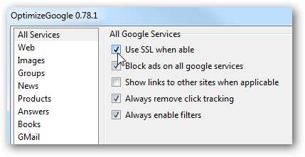 Εάν χρησιμοποιείτε τον Firefox και δεν θέλετε να ανησυχείτε εάν οι υπηρεσίες Google αλλάξουν σε https, τότε ρίξτε μια ματιά στο Πρόσθετο OptimizeGoogle . Μεταξύ άλλων εκπληκτικών τρόπων που σας επιτρέπει να προσαρμόσετε το Google, μπορείτε να το ρυθμίσετε ώστε όλες οι υπηρεσίες να χρησιμοποιούν https όταν είναι δυνατό.