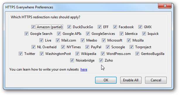 Ένα άλλο εύχρηστο πρόσθετο Firefox από το EFF (Ίδρυμα Electronic Frontier) είναι HTTPS παντού που έχουμε προηγουμένως καλυμμένο . Θα μεταβεί σε πρωτόκολλο https για πολλούς σημαντικούς ιστότοπους και μπορείτε γράψτε τα δικά σας σύνολα κανόνων με αυτό επίσης.