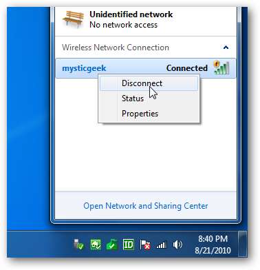 Εάν δεν χρησιμοποιείτε την ασύρματη σύνδεσή σας ενώ βρίσκεστε σε σημείο πρόσβασης, απλώς απενεργοποιήστε την. Αυτό μπορεί να είναι δύσκολο να θυμάστε και ενοχλητικό εάν κάνετε συνεχώς έρευνα στο διαδίκτυο ενώ εργάζεστε. Αλλά αν μπορείτε να προγραμματίσετε τη δουλειά σας σε περιόδους που δεν χρειάζεται να είστε συνδεδεμένοι για καλό χρονικό διάστημα, απλώς απενεργοποιήστε το. Κάντε κλικ στο εικονίδιο Ασύρματο στη γραμμή εργασιών, κάντε δεξί κλικ στο δίκτυο στο οποίο είστε συνδεδεμένοι και αποσυνδέστε.