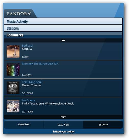 Σελιδοδείκτη τραγουδιών ενώ ακούτε για να τα αποθηκεύσετε στο widget του λογαριασμού Pandora που μπορείτε να ενσωματώσετε στον ιστότοπό σας ή σε κοινωνικούς ιστότοπους όπως το Facebook και το Myspace.