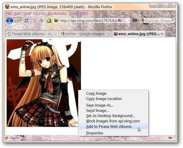 Μόλις κατεβάσετε την επέκταση και την εγκαταστήσετε, είστε έτοιμοι να ξεκινήσετε. Δεν υπάρχουν ρυθμίσεις ή διαμορφώσεις που πρέπει να ληφθούν υπόψη. Μόλις βρείτε μια φωτογραφία που σας αρέσει, χρησιμοποιήστε το μενού με το δεξί κλικ για να προσθέσετε τη φωτογραφία στα Λευκώματα Ιστού Picasa.