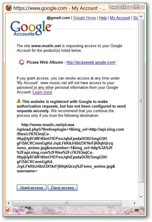 Αφού εισαγάγετε το "Όνομα χρήστη Google", θα δείτε αυτό το παράθυρο που θα περιγράφει λεπτομερώς το αίτημα πρόσβασης στα Λευκώματα Ιστού Picasa. Παρατηρήστε τη δήλωση που αναφέρει ότι «το www.musiic.net δεν θα έχει πρόσβαση στον κωδικό πρόσβασής σας ή οποιεσδήποτε άλλες προσωπικές πληροφορίες από τον Λογαριασμό σας Google.