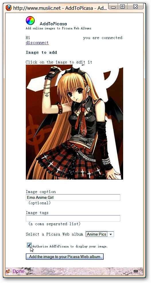 Μόλις κάνετε κλικ στο "Εκχώρηση πρόσβασης", το παράθυρο θα επιστρέψει σε αυτό που είδατε πριν με την επιλογή "Αποσύνδεση" στην κορυφή. Απλώς συμπληρώστε τις πληροφορίες λεζάντας και ετικέτας, επιλέξτε το άλμπουμ Ιστού Picasa στο οποίο θέλετε να προστεθεί η φωτογραφία και κάντε κλικ στην επιλογή "Προσθήκη της εικόνας στο άλμπουμ Ιστού Picasa".