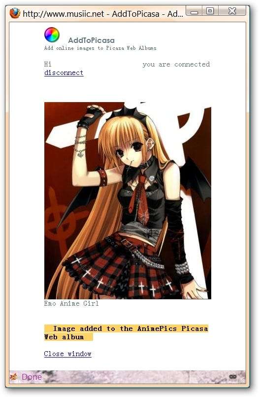 Αφού κάνετε κλικ στο "Προσθήκη της εικόνας στο άλμπουμ Ιστού Picasa", το παράθυρο θα μοιάζει με αυτό. Έχετε τελειώσει όλοι και τώρα μπορείτε να κλείσετε το παράθυρο και να αναζητήσετε την επόμενη φωτογραφία που θέλετε να προσθέσετε ή να επιστρέψετε στην κανονική περιήγηση που κάνατε πριν.
