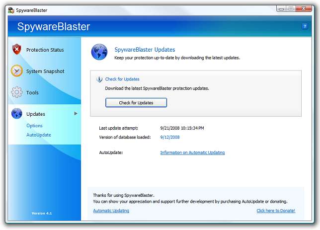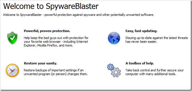 Ένα από τα ευκολότερα βοηθητικά προγράμματα «ρυθμίστε το και ξεχάστε το» είναι το SpywareBlaster του JavaCool. Αντί να περιμένει να σαρώσει και να εξαλείψει το λογισμικό υποκλοπής spyware αφού ο υπολογιστής έχει ήδη μολυνθεί, προφυλάσσει από το να μην μολύνει ποτέ τον υπολογιστή σας από την αρχή.