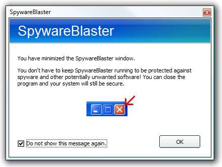 Αυτό είναι το μόνο που υπάρχει! SpywareBlaster είχε κάνει τη δουλειά του και θα λάβετε μια φιλική υπενθύμιση εάν ελαχιστοποιήσετε την εφαρμογή καθώς δεν υπάρχει λόγος να συνεχίσει να εκτελείται. Απλώς κάντε κλικ στο πλαίσιο για να μην βλέπετε αυτό το μήνυμα κάθε φορά.