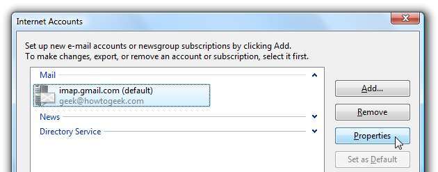 Κάντε κλικ στο κουμπί Τέλος για να επιστρέψετε στο παράθυρο διαλόγου Λογαριασμοί Διαδικτύου και, στη συνέχεια, επιλέξτε τον νέο σας λογαριασμό και επιλέξτε το κουμπί Ιδιότητες.