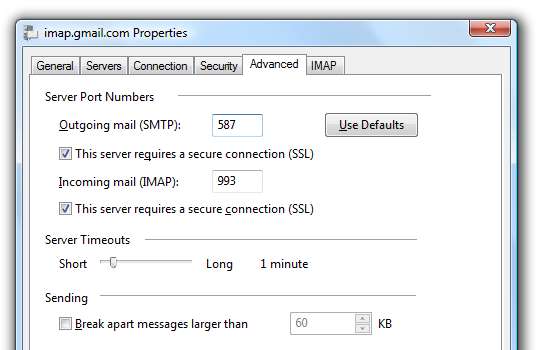 Στην καρτέλα Για προχωρημένους, θα θέλετε πρώτα να ελέγξετε και τις δύο επιλογές για "Αυτός ο διακομιστής απαιτεί ασφαλή σύνδεση (SSL)" και, στη συνέχεια, να επαληθεύσετε ότι οι θύρες έχουν οριστεί ως εξής: