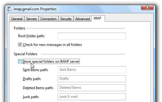Τώρα επιλέξτε την καρτέλα IMAP και καταργήστε το πλαίσιο ελέγχου για "Αποθήκευση ειδικών φακέλων στο διακομιστή IMAP".