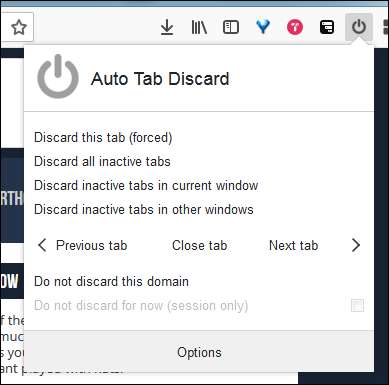 Μπορείτε να απορρίψετε με μη αυτόματο τρόπο τις καρτέλες κάνοντας κλικ στο εικονίδιο της επέκτασης και, στη συνέχεια, επιλέγοντας την επιλογή "Απόρριψη αυτής της καρτέλας (αναγκαστική)". Μπορείτε επίσης να κάνετε πράγματα όπως να απορρίψετε όλες τις ανενεργές καρτέλες ή να απορρίψετε όλες τις καρτέλες στο τρέχον παράθυρο ή σε άλλα παράθυρα, κάτι που είναι πολύ βολικό.