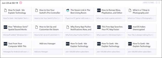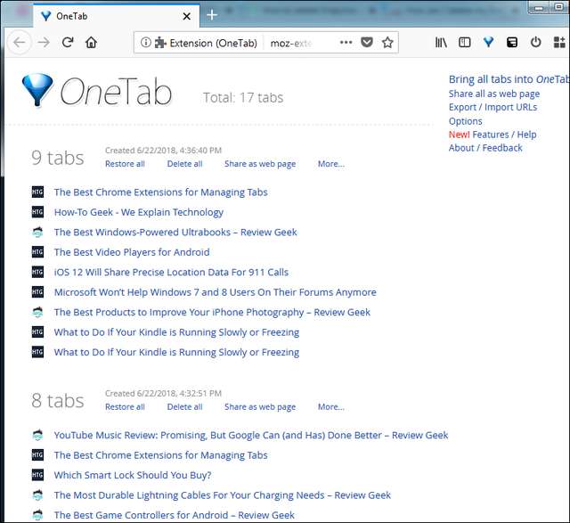 Εάν ανοίξετε περισσότερες καρτέλες στο ίδιο παράθυρο και ενεργοποιήσετε ξανά το OneTab, αποθηκεύει τις νέες καρτέλες στη δική τους ομάδα στην ίδια σελίδα, χωρισμένες κατά την αποθήκευσή τους.