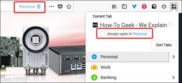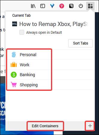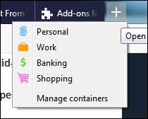 Για να ανοίξετε μια νέα καρτέλα σε ένα συγκεκριμένο κοντέινερ, κάντε κλικ και κρατήστε πατημένο το κουμπί νέας καρτέλας και, στη συνέχεια, επιλέξτε ένα κοντέινερ από το αναπτυσσόμενο μενού.