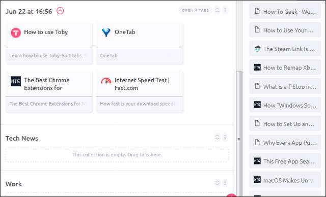 Ο Toby αντικαθιστά τη νέα σελίδα καρτελών με τη δική του οργανωτική σελίδα για τη διαχείριση καρτελών. Ο Toby χρησιμοποιεί Συλλογές για την οργάνωση καρτελών και θα δείτε αυτές που βρίσκονται στα αριστερά της σελίδας. Στην παρακάτω εικόνα, έχουμε συλλογές με το όνομα "Tech News" και "Work".