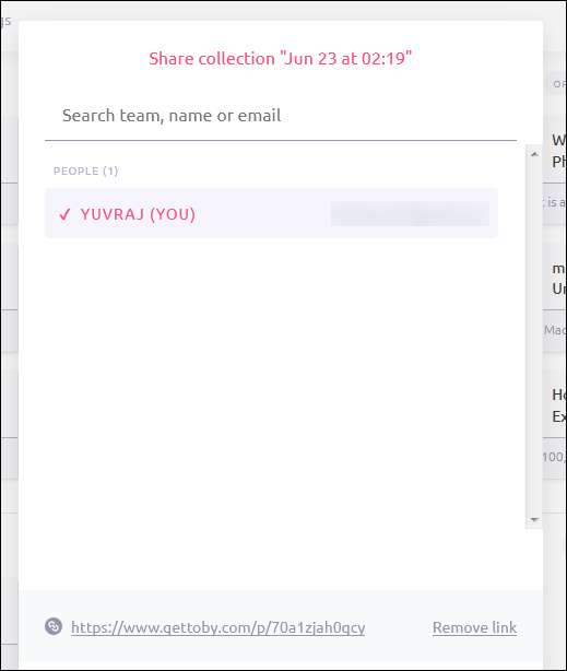 Το Toby λειτουργεί εξαιρετικά ως διαχειριστής καρτελών και σελιδοδεικτών, αλλά η πραγματική του δύναμη έγκειται στις δυνατότητες κοινής χρήσης και ομάδας. Μπορείτε να μοιραστείτε οποιαδήποτε συλλογή πατώντας το σύνδεσμο Κοινή χρήση στα δεξιά του (διαθέσιμο μόνο όταν δημιουργήσετε έναν λογαριασμό). Θα σας δοθεί η επιλογή να λάβετε έναν σύνδεσμο που μπορείτε να μοιραστείτε με άτομα ή να μοιραστείτε τη συλλογή ιδιωτικά με έναν οργανισμό που έχετε δημιουργήσει. Οι οργανισμοί μπορούν ακόμη και να έχουν ειδικές συλλογές για ομάδες.