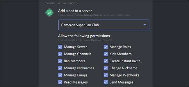 Στη συνέχεια, θα δείτε μια οθόνη όπως η παρακάτω. Αρχικά, επιλέξτε σε ποιον διακομιστή θέλετε να προσκαλέσετε το bot σας. Στη συνέχεια, μπορείτε να εγκρίνετε ή να απορρίψετε δικαιώματα που θέλετε να εκχωρήσετε στο bot σε αυτόν τον διακομιστή. Μπορείτε να απαγορεύσετε τα bots αργότερα εάν σπάσουν ή αν ανακαλύψετε ότι είναι κακόβουλα, αλλά είναι επίσης καλή ιδέα να δίνετε σημαντικά δικαιώματα μόνο στα bots που εμπιστεύεστε. Όταν τελειώσετε, κάντε κύλιση προς τα κάτω και κάντε κλικ στην επιλογή Εξουσιοδότηση.