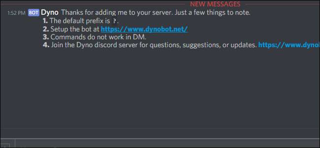 Λίγο μετά την πρόσκληση του bot σας, θα λάβετε ένα μήνυμα σαν αυτό που σας λέει πώς να το χρησιμοποιήσετε. Από προεπιλογή, το Dyno χρησιμοποιεί; για να ξεκινήσετε εντολές αντί για / (προφανώς για να αποφύγετε διενέξεις με άλλα bots ή εντολές), αλλά μπορείτε να τροποποιήσετε τον τίτλο το Δυνο’σ σιτε , κάνοντας κλικ στον διακομιστή σας στο αναπτυσσόμενο μενού στην επάνω δεξιά γωνία και αλλάζοντας το "Πρόθεμα εντολών".