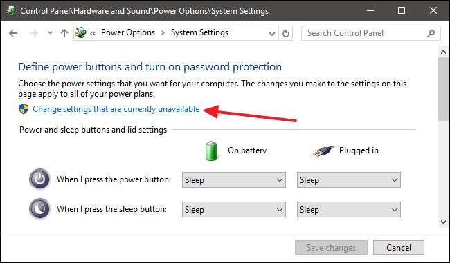 Εάν αυτή είναι η πρώτη φορά που έχετε χάσει αυτές τις ρυθμίσεις, θα χρειαστεί να κάνετε κλικ στην επιλογή "Αλλαγή ρυθμίσεων που δεν είναι διαθέσιμες αυτήν τη στιγμή" για να κάνετε την επιλογή Γρήγορη εκκίνηση διαθέσιμη για διαμόρφωση.