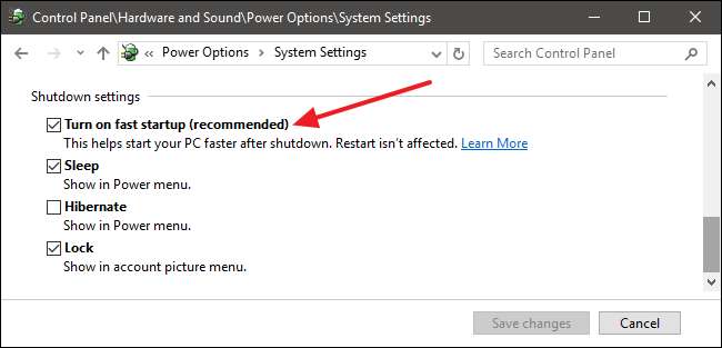 Μεταβείτε με κύλιση στο κάτω μέρος του παραθύρου και θα δείτε την ένδειξη "Ενεργοποίηση γρήγορης εκκίνησης (συνιστάται)" μαζί με άλλες ρυθμίσεις τερματισμού. Απλώς χρησιμοποιήστε το πλαίσιο ελέγχου για να ενεργοποιήσετε ή να απενεργοποιήσετε το Fast Startup. Αποθηκεύστε τις αλλαγές σας και τερματίστε το σύστημά σας για να το δοκιμάσετε.