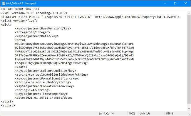 Στα Windows, Linux, Chrome OS, Android ή Mac, μπορείτε να ανοίξετε ένα αρχείο aae σε ένα πρόγραμμα επεξεργασίας κειμένου, αλλά τα δεδομένα XML που θα δείτε ότι δεν υπάρχει πολύ χρήσιμη. Τα δεδομένα επεξεργασίας μπορούν να διαβαστούν μόνο από την εφαρμογή φωτογραφιών της Apple.