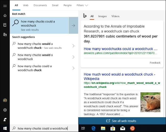 Για παράδειγμα, εάν το μενού Έναρξη αποφασίσει ότι η αναζήτηση ιστού είναι το καλύτερο αποτέλεσμα για την αναζήτησή σας, θα δείτε τα αποτελέσματα αναζήτησης Bing εκεί στο μενού Έναρξη. Εάν αναζητήσετε μια εφαρμογή, θα δείτε επιλογές όπως "Καρφίτσωμα στην Έναρξη" για αυτήν την εφαρμογή. Θα δείτε επίσης μια προεπισκόπηση εγγράφου εάν τα Windows αποφασίσουν ότι ένα συγκεκριμένο έγγραφο στον υπολογιστή σας είναι το καλύτερο αποτέλεσμα.