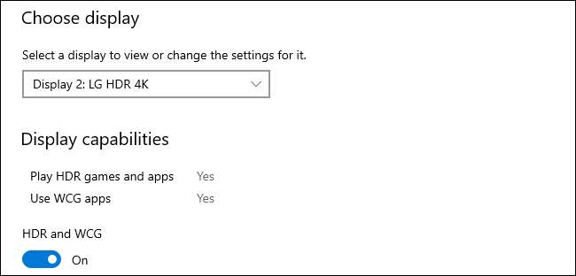 Υπάρχει μια νέα σελίδα "Χρώμα HD Windows" στις Ρυθμίσεις> Σύστημα> Οθόνη. Αυτή η σελίδα σας ενημερώνει εάν το υλικό σας είναι συμβατό με υψηλό δυναμικό εύρος (HDR) και ευρεία γκάμα χρωμάτων (WCG). Αυτές οι λειτουργίες γίνονται πιο κοινές οθόνες 4K υψηλότερου επιπέδου .