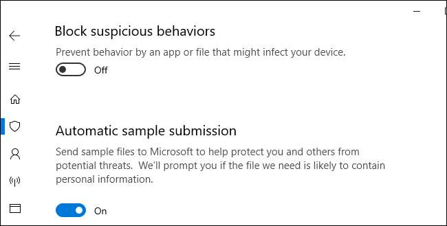 Στην περιοχή Ασφάλεια των Windows> Προστασία από ιούς και απειλές> Διαχείριση ρυθμίσεων, μπορείτε πλέον να ενεργοποιήσετε ένα " Αποκλεισμός ύποπτων συμπεριφορών Επιλογή. Η Microsoft λέει ότι αυτό θα επιτρέψει το Windows Defender Exploit Guard «Τεχνολογία επιφανειακής μείωσης επιθέσεων», η οποία θα βοηθήσει στην προστασία του υπολογιστή σας από εκμεταλλεύσεις.