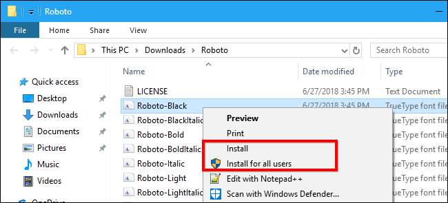 Οι παλαιότερες εκδόσεις των Windows επιτρέπουν μόνο σε χρήστες με δικαιώματα διαχειριστή να εγκαταστήσουν γραμματοσειρές και στη συνέχεια αυτές οι γραμματοσειρές εγκαταστάθηκαν για όλους τους χρήστες σε όλο το σύστημα. Η ενημέρωση των Windows 10 τον Οκτώβριο του 2018 βελτιώνεται και δίνει τη δυνατότητα σε όλους να εγκαταστήσουν γραμματοσειρές. Όταν κάνετε δεξί κλικ σε ένα αρχείο γραμματοσειράς στην Εξερεύνηση αρχείων, μπορείτε να επιλέξετε είτε «Εγκατάσταση» για να το εγκαταστήσετε μόνο για τον λογαριασμό χρήστη σας είτε «Εγκατάσταση για όλους τους χρήστες» για να το εγκαταστήσετε για όλους τους χρήστες του συστήματος. Μόνο η τελευταία επιλογή απαιτεί άδεια διαχειριστή.