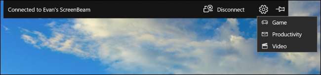 Τα Windows έχουν πολλές "λειτουργίες" που μπορείτε να ενεργοποιήσετε ενώ προβάλλετε ασύρματα. Στη λειτουργία "Παιχνίδι", ο λανθάνων χρόνος της οθόνης ελαχιστοποιείται για να προσφέρει βελτιωμένη εμπειρία παιχνιδιού ενώ προβάλλεται ασύρματα. Στη λειτουργία "Βίντεο", ο λανθάνων χρόνος της οθόνης αυξάνεται για να διασφαλιστεί η ομαλή αναπαραγωγή του βίντεο. Η λειτουργία "Παραγωγικότητα" είναι η προεπιλεγμένη και παρέχει ισορροπία καθυστέρησης για να διασφαλιστεί ότι η πληκτρολόγηση εμφανίζεται ανταποκρινόμενη και ότι δεν υπάρχουν πάρα πολλές δυσλειτουργίες γραφικών κατά την αναπαραγωγή βίντεο.