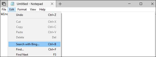 Το Σημειωματάριο λαμβάνει ακόμη και τη δυνατότητα "Αναζήτηση με Bing" - γιατί όχι; Για να το χρησιμοποιήσετε, επιλέξτε κάποιο κείμενο σε ένα έγγραφο σημειωματάριου και, στη συνέχεια, κάντε κλικ στην επιλογή Επεξεργασία> Αναζήτηση με Bing ή πατήστε Ctrl + B.