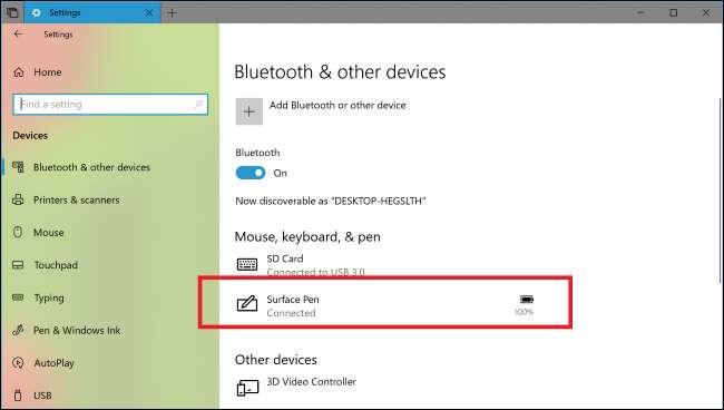 - Επίπεδα μπαταρίας Bluetooth στις Ρυθμίσεις : Θα δείτε τώρα τα ποσοστά μπαταρίας Bluetooth στην οθόνη Ρυθμίσεις> Συσκευές> Bluetooth και άλλες συσκευές. Αυτό λειτουργεί μόνο με συσκευές που υποστηρίζουν αυτήν τη λειτουργία, όπως για παράδειγμα το Surface Pen της Microsoft. Θα δείτε επίσης μια ειδοποίηση όταν μία από αυτές τις συσκευές έχει χαμηλή ισχύ μπαταρίας.
