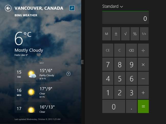 - Βελτιώσεις Snap : Η λειτουργία Snap των Windows 8 ήταν ένα παιχνίδι, επιτρέποντάς σας να τραβάτε μια εφαρμογή σε μια μικρή πλευρική γραμμή στη μία πλευρά της οθόνης σας, ενώ μια άλλη εφαρμογή καταναλώνει το μεγαλύτερο μέρος της οθόνης σας. Τα Windows 8.1 σάς επιτρέπουν να τραβάτε δύο εφαρμογές δίπλα-δίπλα, βλέποντας την πλήρη διεπαφή κάθε εφαρμογής ταυτόχρονα. Σε μεγαλύτερες οθόνες, μπορείτε ακόμη και να τραβήξετε τρεις ή τέσσερις εφαρμογές ταυτόχρονα. Η ικανότητα των Windows 8 να χρησιμοποιούν πολλές εφαρμογές ταυτόχρονα σε ένα tablet είναι συναρπαστική και απαράμιλλη από iPad και tablet Android. Μπορείτε επίσης να τραβήξετε δύο από τις ίδιες εφαρμογές δίπλα-δίπλα - για να δείτε δύο ιστοσελίδες ταυτόχρονα, για παράδειγμα.
