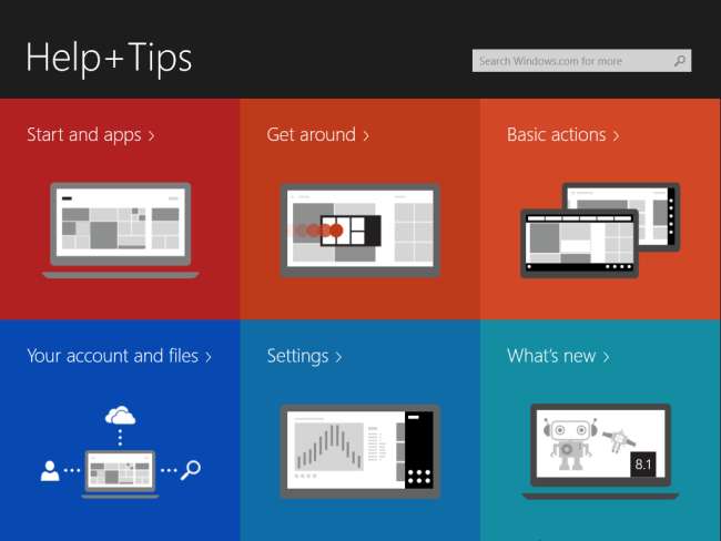 - Βοήθεια & συμβουλές : Τα Windows 8.1 περιλαμβάνουν μια εφαρμογή Βοήθεια + Συμβουλές που θα βοηθήσει στην καθοδήγηση νέων χρηστών μέσω της νέας διεπαφής της, κάτι που η Microsoft αρνήθηκε πεισματικά να προσθέσει κατά τη διάρκεια της ανάπτυξης.
