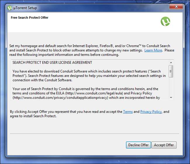 Τα προγράμματα εγκατάστασης που είναι γεμάτα ανεπιθύμητα προγράμματα είναι απολύτως φυσιολογικά στη σκηνή του λογισμικού των Windows. Αυτό ισχύει ακόμη και για καθιερωμένο, νόμιμο λογισμικό. Η Oracle's Χρόνος εκτέλεσης Java επιχειρεί να εγκαταστήσει τη γραμμή εργαλείων ερώτησης. Το μTorrent είναι ένας δημοφιλής πελάτης BitTorrent, αλλά έχετε δοκιμάσει να το κατεβάσετε πρόσφατα; Πρέπει να κάνετε κλικ σε διάφορες προσφορές που επιχειρούν να εγκαταστήσουν το Aduit Search adware και a scammy PC καθαριστικό στον υπολογιστή σου. Αυτό το σκουπίδια επισημαίνεται ως "Προτείνεται από το BitTorrent", οπότε οι λιγότερο έμπειροι χρήστες μπορεί να πιστεύουν ότι είναι πραγματικά προτεινόμενο λογισμικό, όχι ότι πληρώνονται για να προτείνουν ανεπιθύμητες ενέργειες που δεν θα χρησιμοποιούν ποτέ.