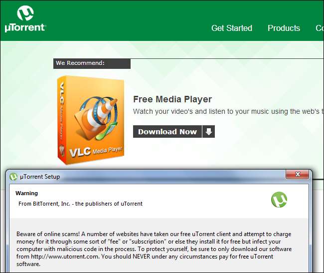 Για να προσθέσετε προσβολή στον τραυματισμό, το µTorrent σας προειδοποιεί στην πραγματικότητα "Προσοχή στις διαδικτυακές απάτες!" όταν το εγκαθιστάτε. Αυτή η προειδοποίηση λέει ότι πρέπει να κατεβάσετε το µTorrent μόνο από τον επίσημο ιστότοπό του, επειδή θα μπορούσατε να μολυνθείτε από κακόβουλο λογισμικό εάν κάνετε λήψη του μTorrent από έναν ανεπίσημο ιστότοπο. Ωστόσο, "προτείνουν" να κατεβάσετε το VLC από έναν σκιερό ιστότοπο τρίτων!