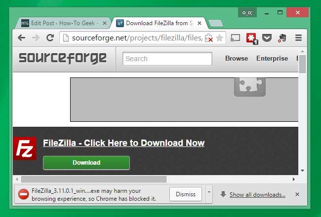 Το Chrome μας εμπόδισε να κατεβάσουμε το FileZilla από τον ιστότοπο του SourceForge, προειδοποιώντας ότι "ενδέχεται να βλάψει την εμπειρία περιήγησής σας".