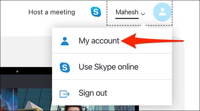 Desde la esquina superior derecha del sitio de Skype, seleccione su nombre y luego seleccione "Mi cuenta" en el menú que se abre.