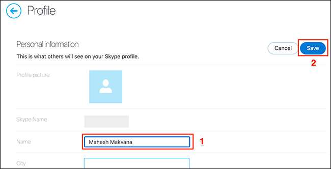 En la misma página de "perfil", desde la sección "Información personal", haga clic en el campo "Nombre". Escriba su nuevo nombre de visualización de Skype.