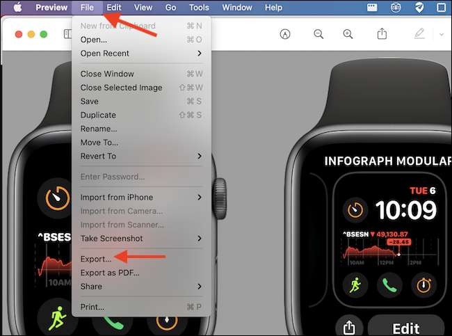 Para comenzar, abra el archivo de imagen en vista previa. Luego, en la barra de menú en la parte superior, haga clic en la opción "Archivo" y seleccione "Exportar".