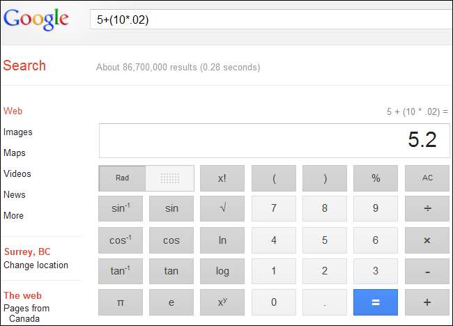 Voit käyttää Googlea laskimena - kirjoita vain nopea laskutoimitus, niin Google antaa vastauksen. Google tarjoaa nyt napsautettavan laskintyökalun, kun haet laskutoimitusta, joten voit käyttää Googlea samalla tavalla kuin laskinohjelman käyttämistä työpöydällä tai älypuhelimessa.