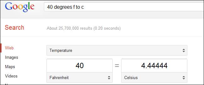 Google voi myös muuntaa useita yksiköitä. Kirjoita vain haku lomakkeeseen X yksikkö yksikköön . Esimerkiksi, 40 astetta f - c muuntaa 40 Fahrenheit-astetta celsiusasteeksi.