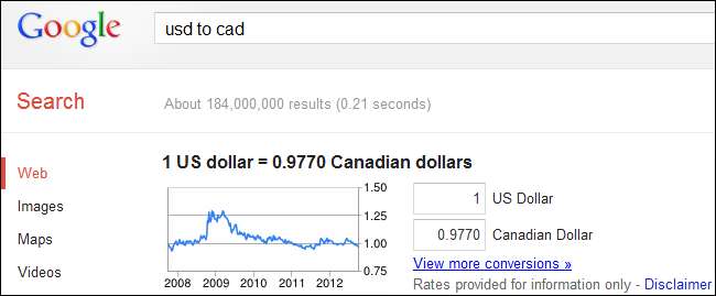 Google voi myös tehdä valuuttamuunnoksia puolestasi. Voit tehdä haun kuten οσδ το καδ nähdäksesi kahden valuutan välisen vaihtokurssin tai tee haku kuten 500 dollaria CAD: ään nähdäksesi kuinka paljon tietty määrä valuuttaa on arvossa toisessa valuutassa.