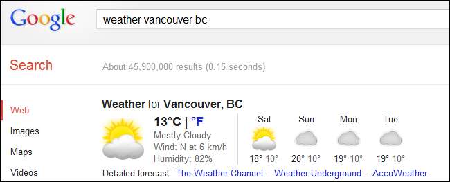 Jos haluat nähdä sään tietyssä paikassa, etsi sää sijainti - esimerkiksi hakea sää New York nähdäksesi sääennusteen New Yorkille. Jos syötät sää ilman sijaintia Google näyttää sinulle nykyisen alueesi sään.