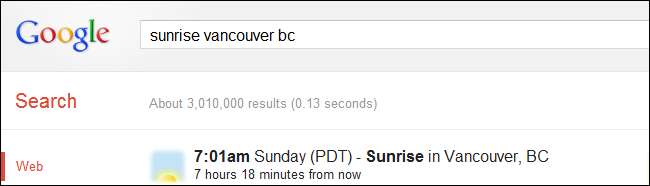 Voit myös tarkastella sijainnin auringonnousu- tai laskuaikoja kirjoittamalla auringonnousun sijainti tai auringonlaskun sijainti . Kuten säähakun, etsinnän yhteydessä auringonnousu tai auringonlasku ilman sijaintia näyttää nykyisen sijaintisi auringonnousu- tai laskuajat.